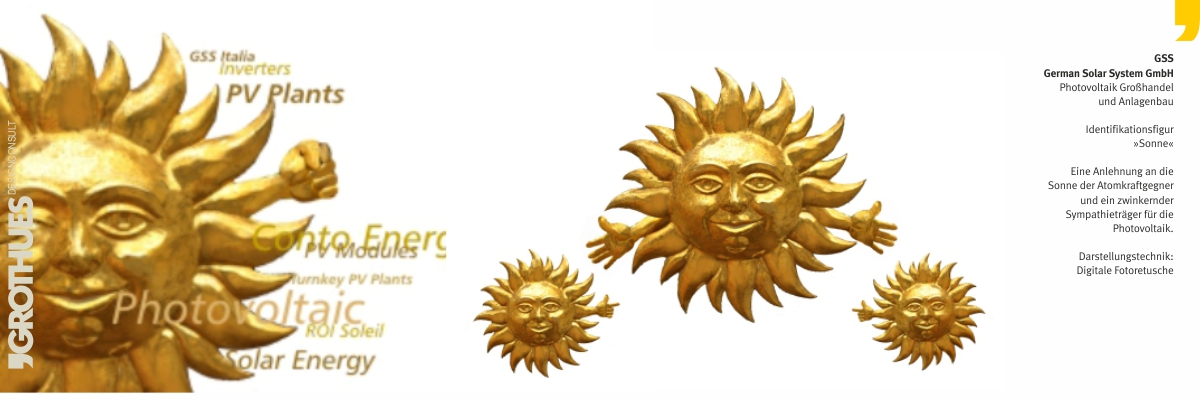 Die »GSS-Sonne« - goldene Fleischwerdung eines Anti-AKW-Protestsymbols und Symbolfigur für Photovoltaik schlechthin. Frech, selbstbewusst, klar in der Aussage. Es gibt sie in diversen Stellungen und Variationen, mit und ohne Augenzwinkern. Sie hat im Laufe von 2 Jahren die Logotype im Stellenwert abgelöst und repräsentiert das Unternehmen charmant und selbstverständlich. Solche Figuren nennt man im Werbedeutsch auch »Sympathieträger«.