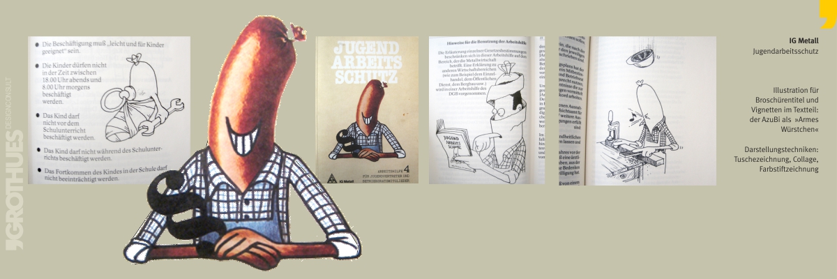 Das »Arme Würstchen« der IG Metall steht stellvertretend für alle Jugendlichen/Auszubildenden in der Metallindustrie und erlebt für den Betrachter (den Jugendvertreter) die Schikanen des Alltags. Die Lektüre der IGM-Broschüre lässt den/die Azubi langsam aus seiner engen Pelle wachsen, in die er/sie gepresst war.