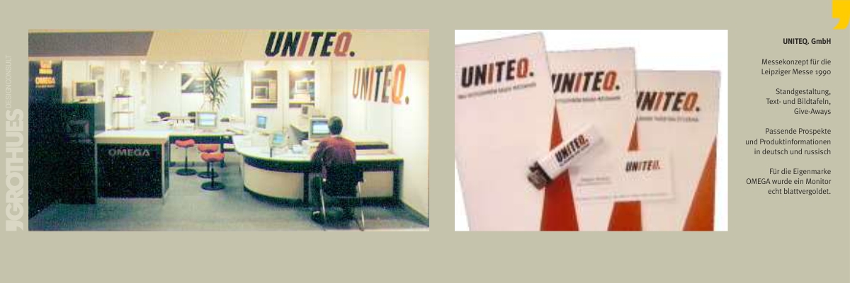 UNITEQ. beeindruckte die Messebesucher der ersten Leipziger Messe nach der Wende mit sowohl hochmoderner als auch hochwertiger PC-Technologie der Eigenmarke OMEGA, die auf dem Stand durch einen echtvergoldeten Monitor repräsentiert wurde.