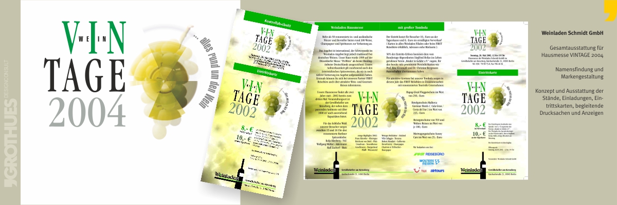Die Weinladen Schmidt GmbH veranstaltet seit 2001 eigene Hausmessen und beteiligt sich auch an externen Veranstaltungen mit einem eigens gestalteten Messtandsystem. Zu jedem Event wurden neben der Standausstattung auch Einladungen, Eintrittskarten sowie Anzeigen in der Fach- und Tagespresse gestaltet.