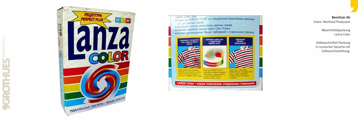 Ein Waschmittel wie Lanza Color muss dem Verbraucher auf der Verpackung seine Vorteile kommunizieren, was auf russisch genau so funktioniert wie auf deutsch.