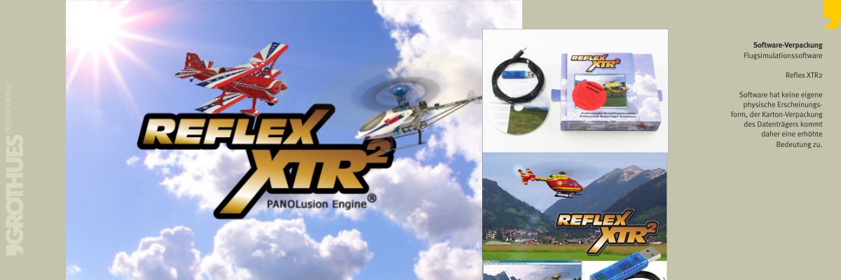 Auch bei der Flugsimulations-Software REFLEX XTR2 stellt die Verpackung das physisch und optisch fassbare Produkt dar. Die Verpackung soll den Nutzen kommunizieren und den Verbraucher verlocken.
