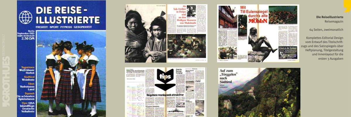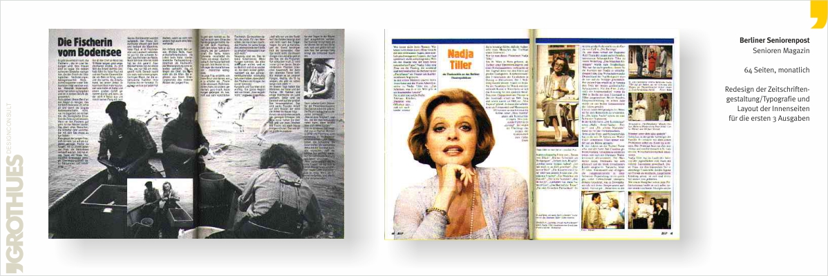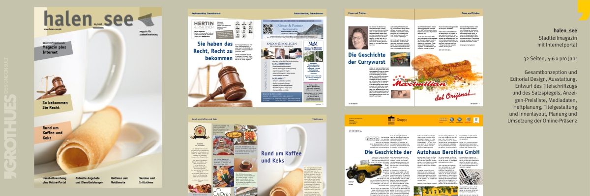 Editorial Design umfasst die komplette Gestaltung und Planung von Zeitschriften. Dazu gehören die Titelgestaltung inkl. Schriftzug, Satzspiegel und Typografisches Konzept, Layout von Beispielseiten oder Kompletterstellung der fertigen Hefte. Zur Ausstattung einer Zeitschrift gehören ebenfalls Anzeigenpreislisten, Mediadaten und Werbematerialien.